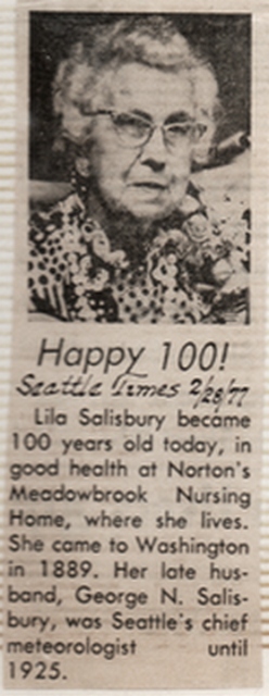 His retirement on August, 1923 completed a 29-year run predicting the weather for Seattle and the Puget Sound. George N. Salisbury died of a stroke on 12 June 1925 in Seattle, Washington, at the age of 65 — (one day before Social Security benefits might have become available to Lila), and was buried in Seattle's Lakeview Cemetery, just north of Volunteer Park.